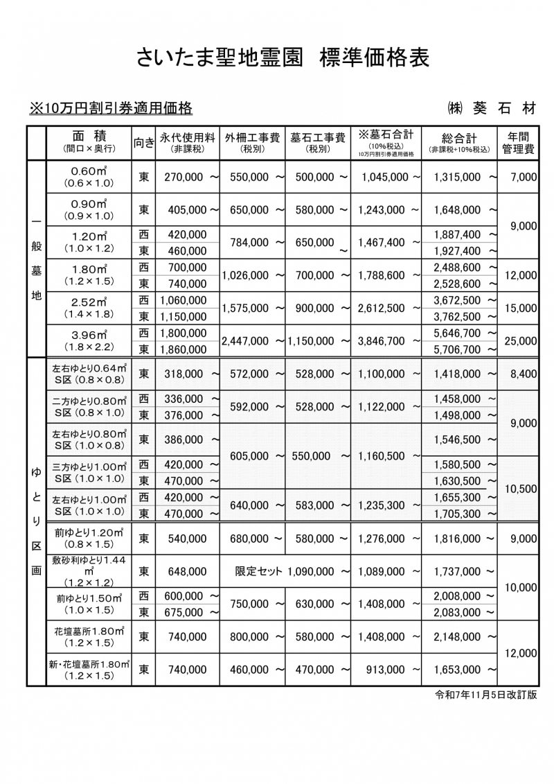 プレートタイプ総額89万円より (永代使用料・墓石代・工事代・基本彫刻料・消費税)